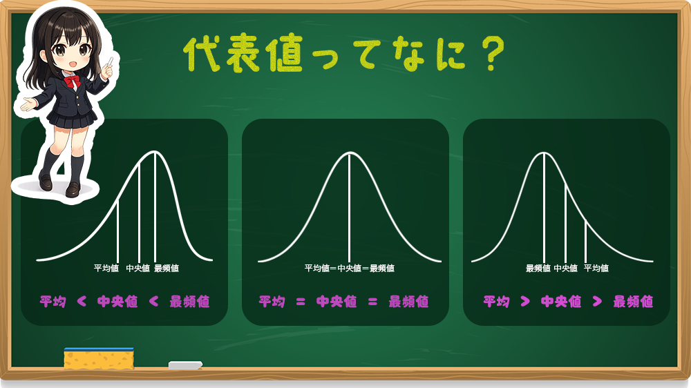 図のように、分布の形によって代表値の位置関係が変わるよ。