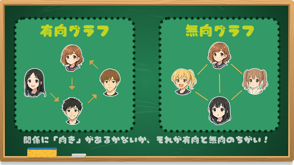 → SNSの「フォロー」は一方向なので、矢印付きの有向グラフとして表現されるんだよ!