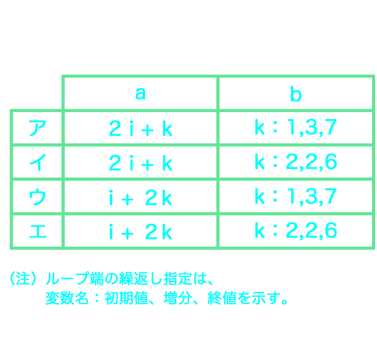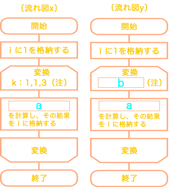 流れ図Xで示す処理では、変数 i の値が、1 → 3 → 7 → 13 と変化し、流れ図Yで示す処理では、変数 i の値が、1 → 5 → 13 → 25 と変化した。