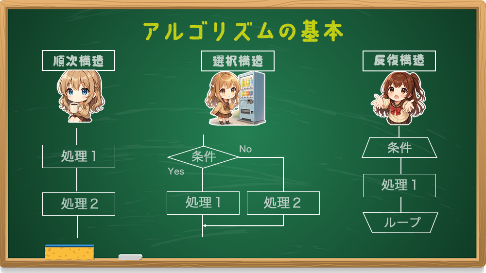 今回は「順次・選択・繰り返し」の3パターンを、図解つきでやさしく紹介するね!