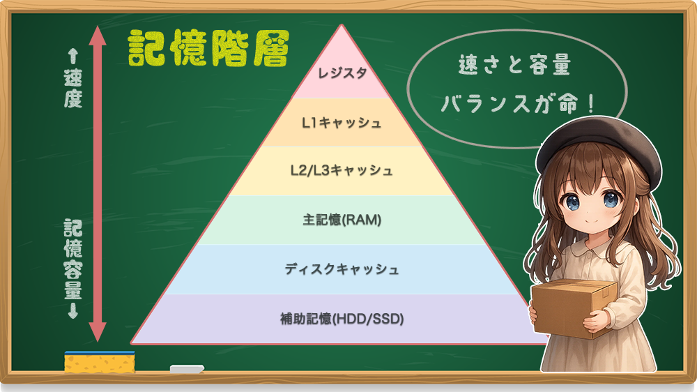 「記憶階層(Memory Hierarchy)」という考え方なの。