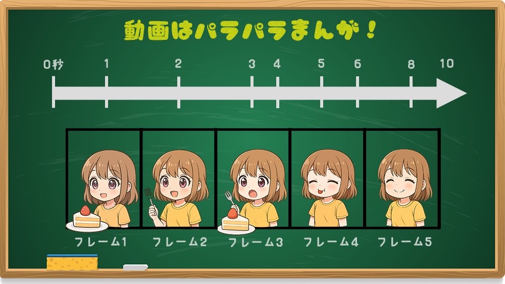 動画は、「フレーム」と呼ばれる静止画の1枚1枚が連続してできているんだよ!