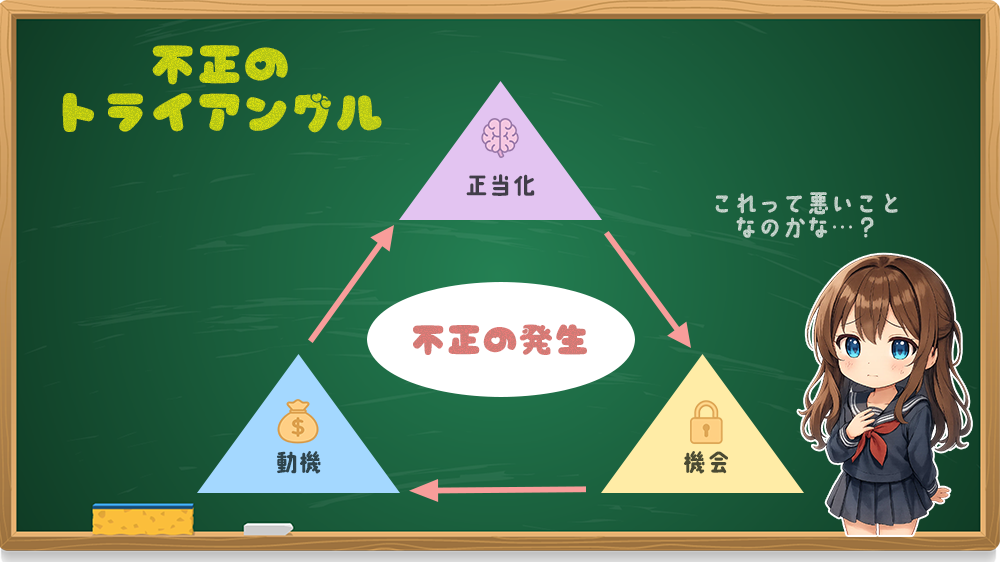 この三角形をつくるのは、動機・機会・正当化の3つの要素だったよね!