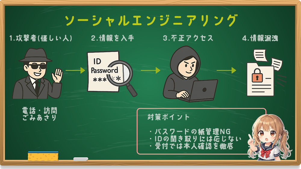というように、人の油断や善意につけ込んで情報を盗むんだって…!